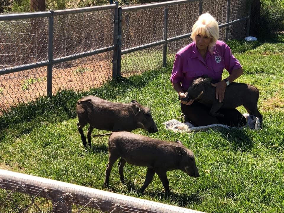 This lovely lady is Prayeri, the heart and soul of Out of Africa, seen here with her 3 warthogs Hamilton (M), Petunia (F), and Poppy-tu (F). These little darlings hold a special place in Prayeri’s heart as they were a gift, as babies, from her late husband Dean.